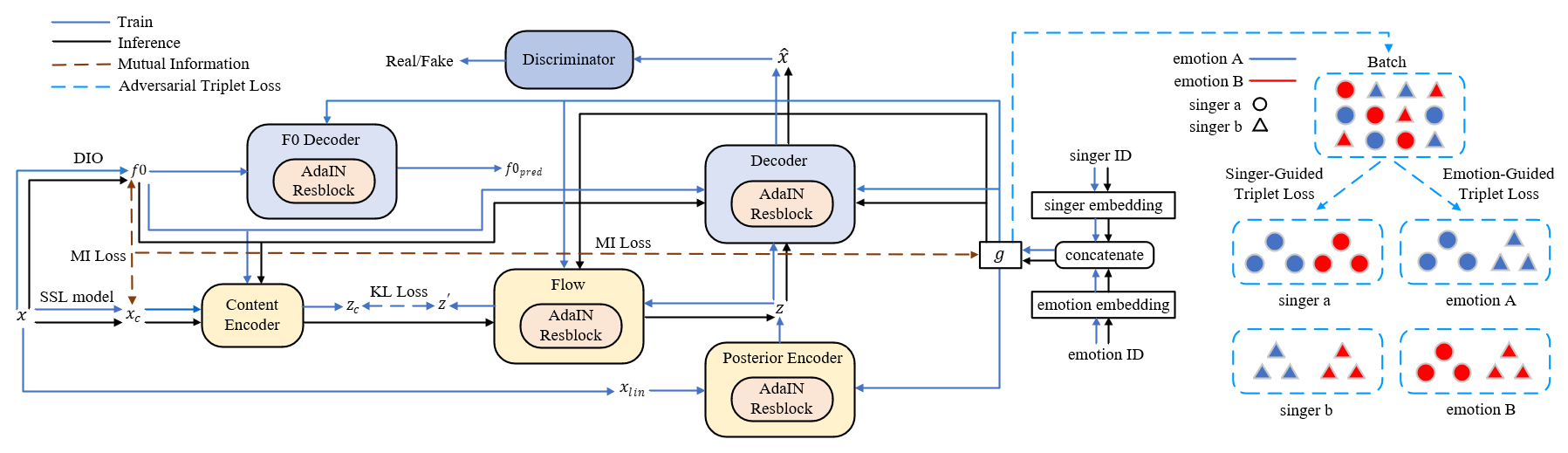 Figure 1. Overall network architecture of system ESVC. Based on so-vits-svc, it combines AdaIN Resblocks, MI loss and adversarial triplet loss.